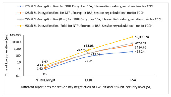 Six session key negotiation algorithms with two security levels were selected in our research and experiments, as presented in Table 4. The security levels are presented in bits [19,20].