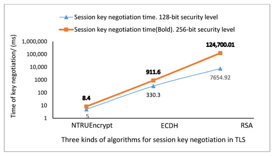 It can be concluded from Figure 6 that, on the 128-bit security level, the speed of session key negotiation using NTRUEncrypt is 66.06 times faster than ECDH, and 1530.98 times faster than RSA. The speed advantage of NTRUEncrypt compared to ECDH and RSA is more prominent when the security level becomes higher. It can be concluded that the speed advantage of NTRUEncrypt is more prominent when deploying higher security level cryptographic algorithms in the communication systems.