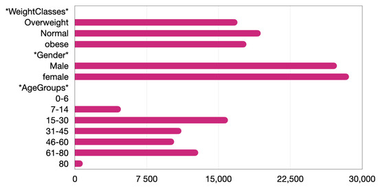 Childhood obesity is a very important issue and is connected to genetic predispositions and behavior. According to the CDC and based on recent studies, obesity prevalence rises to approximately 13% in the age group of 2 to 5 years, 20% in the age group 6 to 11 years and 21.2% among 12 to 19 year olds [10]. Furthermore, childhood obesity is commonly associated with certain communities and specific populations [10]. The age ranges of our dataset can be seen in Figure 1. Clearly, mostly young adults and people above the age of 18 are included, with only a small number of them belonging to the 7–14 age group. Thus, additional datasets need to be collected to draw reliable conclusions with regard to childhood obesity. Demographics and lifestyle determinants could also prove to be useful tools if used as inputs, alongside other nutritional factors and laboratory data, for machine learning classifiers and should be investigated further. Machine learning tools could be used as predictors of child obesity or deployed for automating targeted interventions. This research avenue is, in fact, being followed, and its results will be announced in other fora.