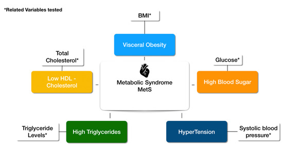 MetS is one of the many risk factors for atherosclerotic cardiovascular disease (ASCVD) and, thus, represents a combination of determinants of risk that compares to that of cigarette smoking, hypertension, hypercholesterolemia and diabetes [14]. Atherogenic dyslipidemia, high blood pressure, high glucose, prothrombotic condition and pro-inflammatory condition are components frequently found in MetS. Clinical hyperglycemia (Type 2 diabetes) is also observed in more advanced stages of MetS. MetS is labeled as a strong cardiovascular risk feature and, even without diabetes being present, it doubles the relative risk for cardiovascular disease. MetS is also considered a worldwide problem and, as urbanisation leads to obesity expansion among the population due to lifestyle shifts, MetS becomes proportionally more frequent. In the latest studies, the presence of MetS has also been associated with higher risk of acute respiratory distress syndrome (ARDS) and increase in deaths for patients with COVID-19 [15]. Currently, a medical rule of thumb associates metabolic disorders (MetS) with at least three of the conditions (biomarkers) mentioned in Figure 2, upon which we further elaborate in the following.