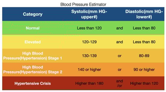 High blood pressure or hypertension is the condition where the force of blood against the artery walls is so strong that, in the mid- to long-term, it can be a main cause of major health problems and, more likely, heart disease. The peak (systolic) number is the pressure when the heart beats. The lowest (diastolic) number is the pressure when the heart is resting between pulses. Normal blood pressure is below 120/80 mm Hg. High blood pressure is a systolic pressure of 140 mm Hg or greater and/or a diastolic pressure of 90 mm Hg or greater, which remains at high levels over time [20]. Blood pressure ranges are defined in more detail in Figure 3.