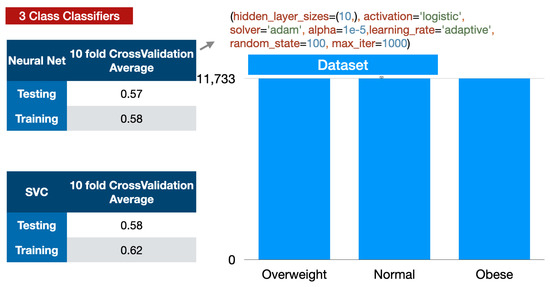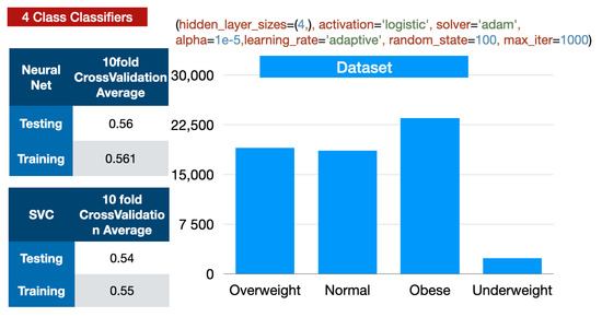 In our previous study [3], we tested and evaluated the ability of neural networks to classify people in classes based on their BMI and using a basic biochemical profile extracted via routine blood exams (Figure 4). The classification process was firstly realized in four classes, then in three and finally in two (2) and a general understanding of the relation was established. Specifically, four BMI classes are defined in the relevant literature, namely “obese”, “overweight”, “normal” and “underweight”. At each stage, accuracy increased while classes were thinned into smaller groups, as in Figure 5. Thus, the idea of a cascaded classifying method was conceived in accordance with similar previous approaches with regard to the recommendation problem [25,26]. At the same time, it became apparent that blood exams held sufficient information for a system to be tested in a greater variety of health states. Going forward, the data used would be thoroughly analyzed to ensure that no bias was intended in the classification system. The results of each classifier would be cross-examined by using comparison matrices. In the current paper, we report on our study of binary and one-class support vector machine (SVM)-based classifiers, which we also compare with several other classifiers.