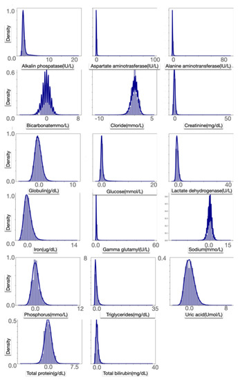 When examining the biochemistry profile, we observe mostly normally distributed values among all variables, as can be seen in Figure 7. The long tails observed in some variables suggest that more investigation could lead to the retrieval of valuable information.