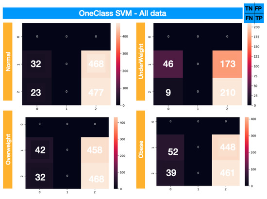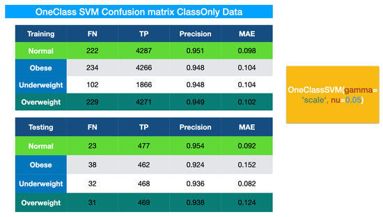The dataset, the same as earlier on, was tested as per weight category. The corresponding results are summarized as the number of correct and incorrect predictions both in known (i.e., training) and unknown (i.e., testing) data. As seen in Figure 9, the classifier can easily correctly identify the class examined when data are unknown (testing sample). To evaluate identification accuracy, the tested sample included random data points from all classes to ensure high quality results and to simulate real world circumstances. The test and evaluation results presented in Figure 10 are an indicator of a well-defined sample of blood exams that can easily identify patterns and classify as per the task set for the system. In all cases, precision was estimated to about 92–95% with a nu parameter of 0.05.