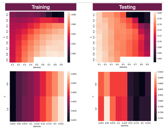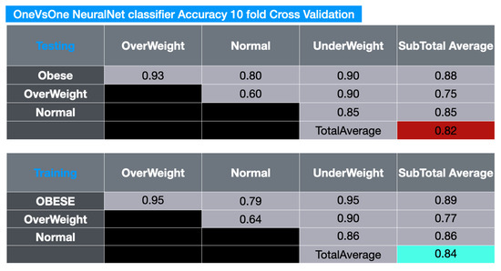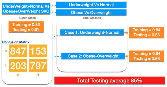 Firstly, two larger data groups (super-classes) were considered. The first group contains samples from both the underweight and normal classes, while the second group contains samples from both the overweight and obese classes. In this grouping, the samples in the extreme classes are combined with the samples of their corresponding neighboring classes, forming now only two major (super-)classes as opposed to the previous four weight classes. Next, when a binary classifier returns one of the two major classes, a second classifier returns a finer classification into one of the two (super-)classes that constitute it. That is, when the first classifier returns the combined underweight-normal class, the second classifier returns either the underweight or the normal class. Similarly, when the first classifier returns the combined overweight–obese class, the second classifier returns either the overweight or the obese class. In this cascade (two-level) classification scheme, one out of four classes is eventually returned, similarly to the original one-vs.-one four-class classifier described earlier in Figure 12. However, the cascade classifier is shown to perform significantly better when tested and evaluated. Indeed, the total testing average of all processes achieves an accuracy of 85%, as shown in Figure 11. In all scenarios, about 4000 data-points were used distributed equally between classes (i.e., 2000 overweight vs. 2000 normal weight) from which a 10% sample was retained for verification(testing sample). Experiments were run on Python. All data were scaled within the 0 to 1 interval and a radial basis function kernel was used. Using grid search for the regularization parameter(C) and gamma(G), we concluded that accuracy was maximized when C is 1 and G is equal to 0.05 or 1/n_features, where features are 17. The search was conducted in two stages. In the first stage (line one of Figure 13), we incremented each run by one (step). When C was closer to 1 and gamma closer to 0, the accuracy increased; thus, to limit the search loop, we redesigned the grid search where C was in the range of 0.9 and 1 and gamma between 0.025 and 0.225, as can be seen in Figure 13. In Table 4, we show the kernels tested and their respected accuracy.