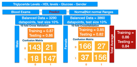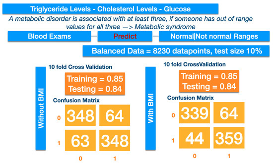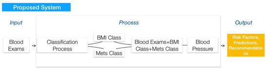 In this paper, we proposed a system (of superior performance) to predict MetS from blood exams as in Figure 18. Specifically, blood exams were used as input, but our efforts focused on the use of as small a number of parameters as possible for the initiation of the classification process. The classifier in the system predicts the BMI class (“underweight”, “normal”, “overweight” and “obese”) and MetS state (“MetS present” and “MetS not present”) without using related factors.