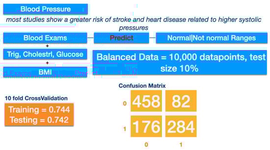 Finally, to complete our system, we enhanced it with a preliminary blood pressure predictor, which we plan to expand and improve further in a future system version. In corresponding experiments, we implemented optimized methods for increasing accuracy. The results can be seen in Figure 17. Specifically, systolic blood pressure (SBP) was predicted within and outside of normal ranges. Blood exams, triglycerides, total cholesterol and BMI were used as features. The 10-fold cross validation accuracy in the testing sample was 74%, which is very encouraging and will be improved further.