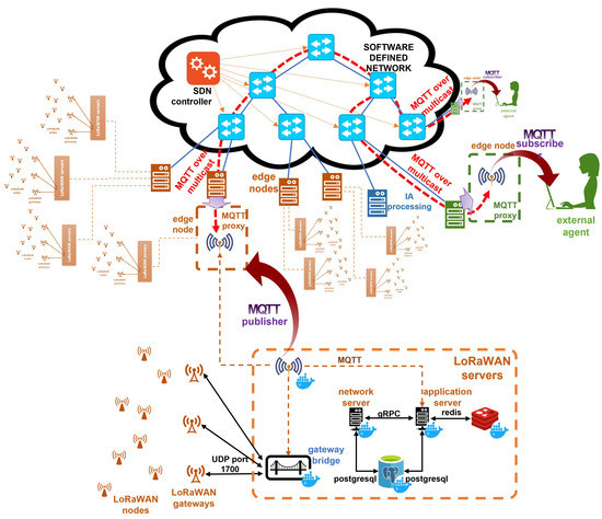 Figure 3 shows the proposed architecture, which consists of an SDN network connecting edge nodes. These nodes will implement MQTT proxy functionality and/or AI processing. These edge nodes will connect with a node or cluster that will implement the different entities of a LoRaWAN network, that is, the network server, the application server and a bridge that allows the connection between the network server and the gateway, as well as the necessary databases. The gateway allows the radio connection with the LoRaWAN nodes, which will be the sensors and actuators that send environmental information. A typical LoRaWAN network would also include an MQTT broker, which in this case is replaced by the MQTT proxy.