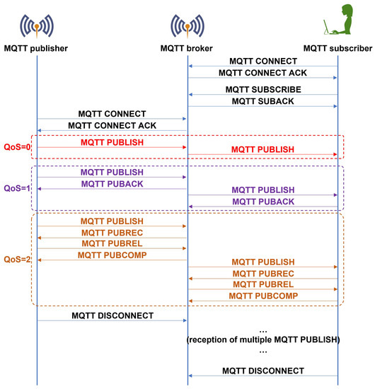In order to have a better understanding of the MQTT protocol, Figure 4 depicts the messages exchanged between the publisher and the subscriber through the MQTT broker. All these messages are transmitted over TCP (port 1883 by default, or port 8883 for secure MQTT, i.e., over TLS).