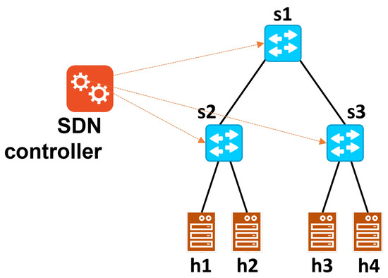 As proof of concept, an SDN network has been implemented using Mininet [15] which will create a tree topology with the required number of levels with their corresponding fanouts. For initial testing, we employed a tree topology with 3 switches, i.e., a root switch (s1) and two leaf switches (s2 and s3), which connect 4 edge nodes (h1 and h2 connected to s2, and h3 and h4 connected to s3), see Figure 8.