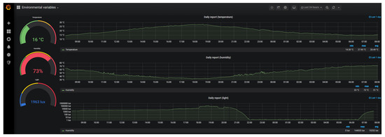 Figure 11 shows part of the data displayed in Grafana in our prototype. In this example, a LoRaWAN device with several sensors measures temperature, humidity and light. The device sends the data via LoRaWAN to a gateway, which is connected to the corresponding LoRaWAN network and application servers. The application server is connected to one of our MQTT proxies, which sends the information over MQTT to other proxies but also to our Grafana platform. As it can be seen, as an example, instantaneous temperature, humidity and light values and graphs with the values of the last day are shown. In the implemented dashboards, graphs of the last hour and with the minimum, average and maximum values of these metrics are also displayed for the last day per hour, and for the last week and last month per day.