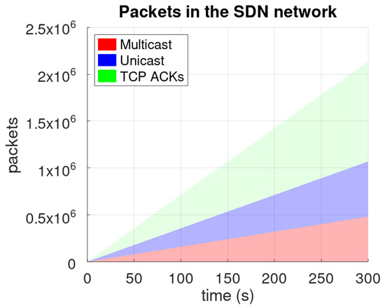 Since we are considering in this example 8 cities with 200 gateways per city, assuming 1 message every 40 s (as in TTN), Figure 15 shows the evolution of the number of packets within the SDN network. The reduction in the number of packets is 55% if we only consider data packets, and 77.5% if we also take into account TCP ACKs.