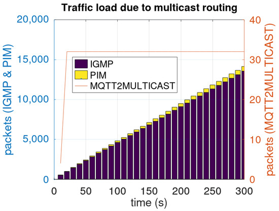 Since MQTT proxies aggregate many subscribers, we assume that most likely there is at least one subscriber for a specific topic (a specific ApplicationID in our LoRaWAN network, which aggregates several MQTT topics, as discussed in Section 4). This means that, using MQTT2MULTICAST, only the initial MQTT2MULTICAST requests and replies are required. Assuming the previous scenario () and one topic (i.e., one ApplicationID mapped to one multicast IP address), the number of messages is very low (only 32 packets). However, the number of messages for joining/maintaining IGMP groups and the PIM-SSM messages to create the multicast routing trees are much higher. We create specific experiments using our network prototype (based on Mininet and RYU) with both solutions (PIM-SSM and MQTT2MULTICAST). Figure 16 compares both situations, being near 15,000 messages after 5 min in the second case. Thus, our solution highly decreases the required signaling for multicast routing.