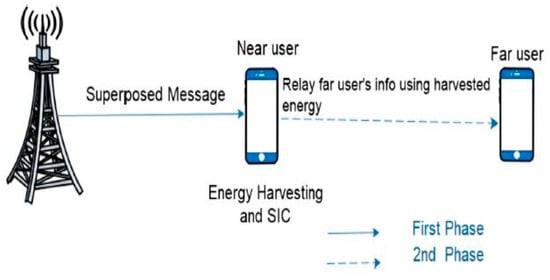 Hence, we use simple binary phase-shift keying (BPSK) in our system with its advantages compared with other formats. Research efforts are exploring all the possible means, including NOMA-assisted cooperative systems, to tackle the problems of distance shortages and power losses in THz communications. Cooperative networking with its relaying categories offers multiple advantages such as reliability and capacity with better coverage area, enhancing overall performance. When applied to cooperative networks, the SE of NOMA can be reasonably improved to support extra (blocked, weak, or cell-edge) users in the short-distance THz transmission, significantly when deploying energy harvesting (EH) with NOMA-based cooperative networks [18]. It represents the main topic of our paper in THz communications. Hence, we use decode-and-forward (DF) relaying because NOMA is adopted in our system. Relaying user implies a copy of the far (weak) users’ signal (to decode and remove it before decoding the intended strong user’s signal in NOMA) included in the superposed signal received by that user. We reasonably utilize that to achieve the objective of relaying as an additional advantage, which is better than using an extra relaying device with extra costly power-consuming complexity. The repetitive use of cooperative networks causes the drainage of the relaying user’s battery, leading to system failure because THz-NOMA requires high computational SIC procedures at the Rx. Thus, research efforts aim to overcome the challenge of moving toward green communications [19] by applying the EH technique. Energy and information are sent to other destinations by exploiting the energy of radiofrequency (RF) signals that exist everywhere around most devices. EH enables devices to harvest that energy by using simple RF circuits. We can then utilize that harvested power to use it again with our transmissions to send our signals without applying an extra burden to the relaying user’s battery. Relaying user divides the received signal’s power into EH and information decoding through EH power splitting, allowing the implementation of energy harvesting and information decoding at the same time, leading to the principle of simultaneous wireless information and power transfer (SWIPT). SWIPT qualifies the near-relaying user to capture power from the transmitted signal from the source and uses that energy to relay information to the far user, as shown in Figure 1 [18]; this improves the system throughput and outage probability accordingly.