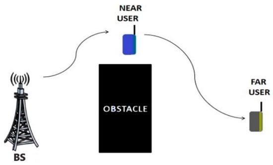 The proposed simple system in Figure 3 can work in a terrestrial open space use case, where THz-NOMA smallest single-cell downlink transmission with a cluster of two paired users is considered. The BS implements superposition to send signals to the two users simultaneously near user (NU) and far user (FU) by using SISO with a high-directional antenna. An obstacle is located in the path between BS and FU, causing extreme shadowing. Thus, the FU is not capable of detecting its blocked or weak signal; however, NU has a strong connection with the BS. Under NOMA fundamentals, firstly, FU’s signal must be decoded by NU before performing SIC to remove it and consequently decode NU’s data. Thus, NU already has a copy of the FU’s information. Accordingly, NU can assist FU’s connection by playing the role of DF relay; however, the NU battery’s energy does not suffice to relay the information to the FU. For that purpose, we proposed NU to perform the power-splitting protocol of EH (SWIPT) to capture power from BS and RF energy surrounding NU. The entire transmission process is performed in two stages. In the first stage, NU receives the transmitted signal from BS.