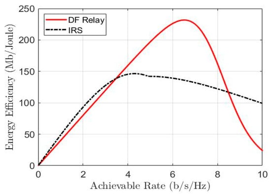 According to the comparison in Figure 4, DF relaying outperforms the new IRS technology (despite its unique advantages) in specific cases, whereas IRS needs a huge number of bulky power-consuming reconfigurable elements to be competitive because of the obtained low channel gain due to the two transmission stages it propagates from source to destination throughout reflection (e.g., IRS needs a place to be deployed in, with continuous maintenance); however, in DF relaying, the signal is transmitted twice with different channel gains. The EE of using DF relay with THz-NOMA, including EH, demonstrates the validity of this system even for very-high-rate communications.