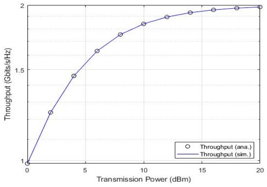 In this section, we manipulate mathematical analysis and simulation of the main system model, exploring the system performance in terms of sum-throughput and outage probability based on the parameters of Scenario1 mentioned in Section 4 and Section 5 (with 20 dBm transmit power) to validate our optimized system model analysis, achieving our intended objectives.