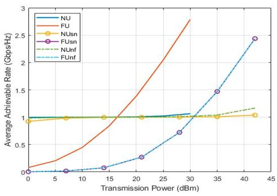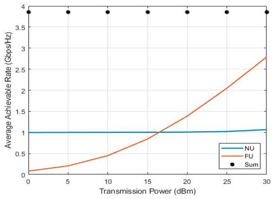 Figure 10 illustrates an observable difference between the two scenarios and how our main Scenario1 outperforms Scenario2 at NU and FU despite setting better parameters’ values to Scenario2 (lower frequency, wider BW, and much power). On the one hand, in Scenario1, NU is saturated at the target rate immediately, and FU is met at the NU at 17 dBm power, where the NU with a longer BS-NU distance is saturated using 1.4 dBm power, and the FUs of Scenario2 are met at their NUs using 31 dBm power. All Scenarios’ FUs data rates still increase exactly as explained in Figure 7. On the other hand, the enlarged BS-NU distance case shows more transmission effect than the enlarged NU-FU distance case by comparing the two cases in Scenario2.