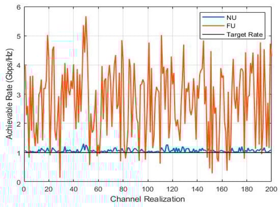 In Figure 9, the FU still does not have better stability than the NU despite the higher data rate, and the FU instantaneous rate is pivoted around the same value it reached in Figure 7 with few spikes beneath the target rate. This condition explains the reasonable difference in outage performance between the two users.