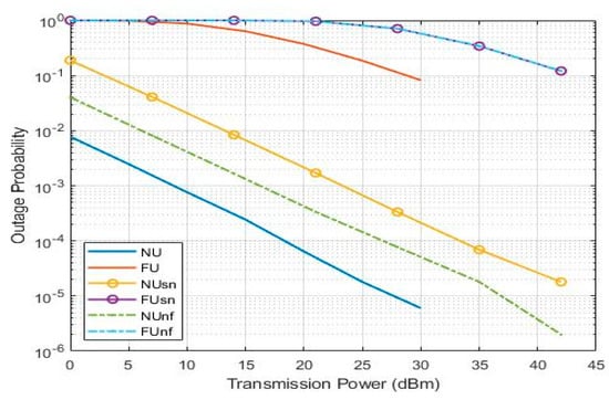 In outage probability comparison, Figure 11 depicts how our main scenario outperforms Scenario2 in NU and FU despite setting better parameters’ values to Scenario2 (lower frequency, wider BW, and much power). On the one hand, in Scenario1, NU and FU show better outage performance than NU and FUs of Scenario2. On the other hand, the enlarged BS-NU distance case shows more transmission effect than the enlarged NU-FU distance case, regarding NU’s outage performance by comparing the two cases in Scenario2. This condition is because the NU with a longer BS-NU distance outage probability is longer than that of a longer NU-FU distance.