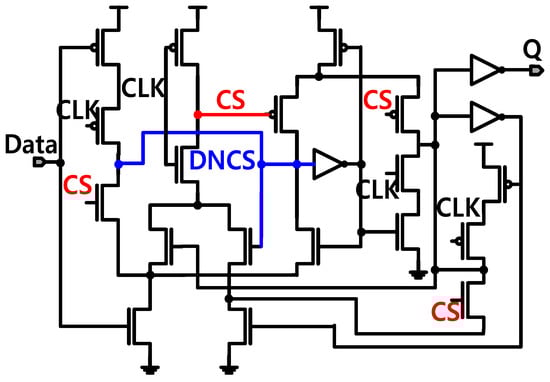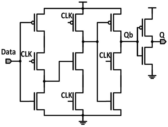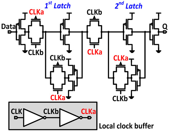 The rapid development of CMOS process technology has facilitated the design of high-performance and highly integrated circuits and systems [1]. Further, it is essential to apply the CMOS process technology for many kinds of low-power digital basic building blocks, such as flip-flop (FF), memory, arithmetic logic unit, and so on [2]. Among them, the design of an FF, which represents the primary synchronous logic component of system-on-chip frameworks, has been widely studied [3,4,5,6,7,8,9,10,11,12,13,14,15,16,17,18,19,20]. Figure 1 shows the circuit diagram of transmission-gate flip-flop (TGFF), which has been widely used in the field of digital systems [3]. It is composed of conventional 24T (T: number of transistors) and two latches. When CLK (or CLKa) is high, the first latch at the left side holds the previous input data. Then, it is transferred to the second latch on the right side when CLK is low. It means the output, Q, is holding the input data until the next CLK is high. Thus, a positive edge-triggered data FF is easily obtained with the circuit diagram of TGFF, as shown in Figure 1. However, TGFF has a high power dissipation due to a large number of complementary clock nodes. Whenever clock nodes are changed, huge short-circuit currents are generated at the transistors. Thus, TGFF has a drawback of large power consumption. In order to overcome the disadvantage of TGFF, an 11T flip-flop shown in Figure 2 has been reported [4]. While TGFF uses a dual-phase clock, Figure 2 uses only a single-phase clock. Thus, it is called a true single-phase clock flip-flop (TSPCFF). The TSPCFF has a lower power consumption due to single-phase clock operations and the use of fewer transistors compared to TGFF. However, this scheme of TSPCFF undergoes a performance degradation due to sub-nanometer CMOS technology with a low supply voltage under 1.8 V. Further, it has many glitches and non-static behaviors, because there are a lot of internal floating nodes. Even though it has less internal nodes, many internal floating nodes generate huge short-circuit currents and large power consumption.