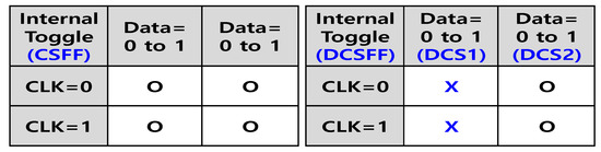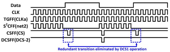 Figure 6 shows the circuit diagram of the proposed dual change-sensing flip-flop (DCSFF). The aim of DCSFF is to minimize the power consumption by the reduction of internal transitions and the elimination of short-circuit currents that generate glitches in CSFF. Notably, since the continuous internal transitions are caused by CLK without the influence of output node, Q of FFs, those redundant transitions result in an increase of dynamic power consumption. The timing diagram which demonstrates the redundant transitions of conventional FFs is shown in Figure 5. The TGFF shows continuous redundant transitions due to the local clock buffer (CLKa and CLKb), whereas net2 of S2CFF involves continuous redundant transitions only when the data are “0”. The CS nodes of CSFF shown in Figure 4 reduce the redundant transitions compared to those of S2CFF because the redundant transitions only occur at the data transitions. To significantly minimize those redundant transitions, the proposed DCSFF divides CS nodes into two nodes (DCS-1 and DCS-2). DCS-1 and DCS-2 replace CS nodes when the data are rising and falling, respectively. The redundant transitions of CSFF and DCSFF generated by the data and CLK have four states shown in Figure 7. DCS-1 can eliminate the redundant transition when the input data are rising (Data = “0” to “1”). Compared to the conventional FFs, therefore, the proposed DCSFF has the least redundant transitions, which results in the minimum dynamic power consumption.