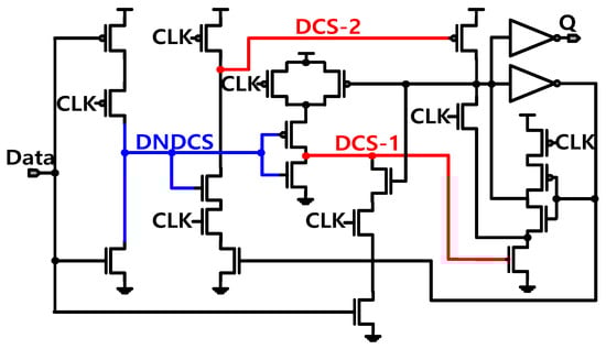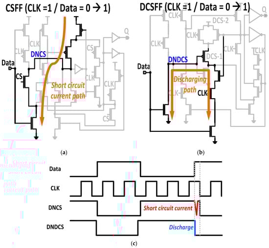 The left side of Figure 8a shows the process of glitch generation due to the short-circuit current in the CSFF. When the CLK maintains the “1” state, the CS node is discharged to detect the input data rising. As the input data changes “0” to “1”, the discharge path of DNCS is generated. Thus, a huge short-circuit current is generated with the glitch of DNCS, although the CS is discharged before the DNCS is discharged to maintain a value of “1”. Further, the DNCS should not retain the “1” state to eliminate the mechanism by which the short-circuit current in the CSFF is generated. On the contrary, the operation principle of the proposed DCSFF is shown in Figure 8b. The DNDCS of DCSFF is a similar node to the DNCS. In the same way, the DCSFF allows DCS-1 to hold “0”, even if the DNDCS is discharged without maintaining “1”. Therefore, no additional operation is required to maintain “1” in the DCSFF. As shown in Figure 8c, while DNCS has a serious short-circuit current, the DNDCS does not generate a short-circuit current, even if CLK remains in the “1” state when data are rising with DCS-1. Therefore, the proposed DCSFF reduces the dynamic power consumption by half compared to CSFF. Furthermore, the proposed DCSFF consumes less power than that of CSFF when the data activity ratio is high.