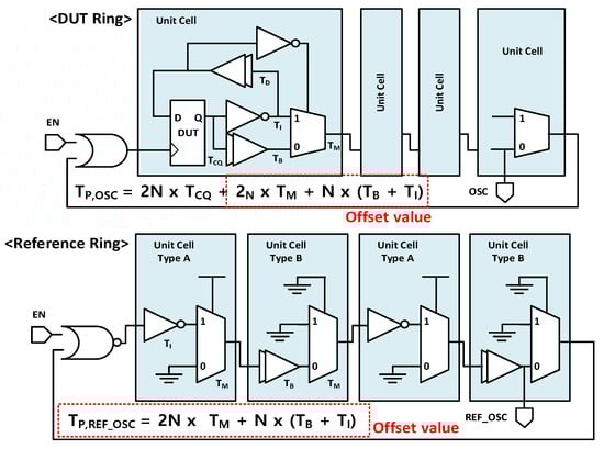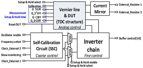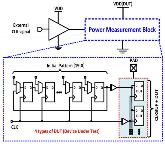 In order to implement an accurate comparison between conventional FFs and the proposed DCSFF, efficient on-chip testing circuits to measure many performance parameters should be considered. For example, the considered parameters are the power consumption, setup time, hold time, C-Q delay, data activity factor, etc. The measurement blocks are designed to realize the on-chip testing of each parameter. The setup and hold time measurement block is shown in Figure 9, which consists of a delay chain and an external monitoring block to encode the outputs and predict the internal skews [17]. Figure 10 shows the C-Q delay measurement block [18,19,20]. It has a ring oscillator structure, and the C-Q delay can be measured when we consider the difference in the frequency between the device under test (DUT) and reference rings. Figure 11 shows the power consumption measurement block. For the power consumption measurement block, the data activity factor is designed to be regulated. The initial external patterns are applied to the DUT periodically with a constant pulse signal. The data activity can be adjusted to range from 0% to 100% in 10% intervals.