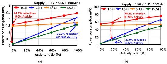 Figure 13 shows the measured power consumption, according to the increase of data activity ratio from 0% to 100%. The power consumptions of each FF have been measured under two conditions: (a) 1.2 V/100 MHz and (b) 0.5 V/10 MHz. In terms of data activity ratios, the CSFF and DCSFF almost do not consume power at 0% data activity ratio (=no leakage) because the drastic reduction of internal transition nodes is available. Thus, the CSFF and DCSFF have low absolute power consumption, even though the TGFF and S2CFF have a large power consumption when the data activity ratio is low. At the data activity ratio of 0%, for example, the power consumption of DCSFF is smaller by 94% than that of S2CFF from Figure 13a,b. Further, at the data activity ratio of 20%, for example, the power consumption of DCSFF is smaller by 78% than that of S2CFF from Figure 13a,b. By the way, since the CSFF is more sensitive to the data activity ratio than that of DCSFF, the slope of power consumption of CSFF is steeper by about 26% than that of DCSFF. When the data activity is 20%, the DCSFF has a 22.1% and 22% lower power consumption at 1.2 V/100 MHz and 0.5 V/10 MHz, respectively, compared to the CSFF. When the data activity is 100%, the power consumption of DCSFF is smaller by 26% than that of the CSFF.