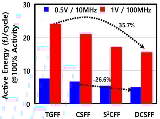 However, the slope of power consumption of CSFF and DCSFF is two or three times steeper than that of TGFF and S2CFF, according to the increase of data activity ratios. At the data activity ratio of 100%, the power consumption of CSFF is bigger by 20% than that of S2CFF, and smaller by 15% than that of TGFF. However, the power consumption of the proposed DCSFF is always smaller than that of TGFF, S2CFF, and CSFF. Figure 14 shows the comparison data of the active energy consumption at the data activity ratio of 100%. The active energy of DCSFF is reduced by 35.7% and 26.6% compared to that of the TGFF and CSFF, respectively. Further, the active energy consumption of DCSFF is smaller by 11% than that of S2CFF. Therefore, the proposed DCSFF has the lowest power consumption among other conventional ones.