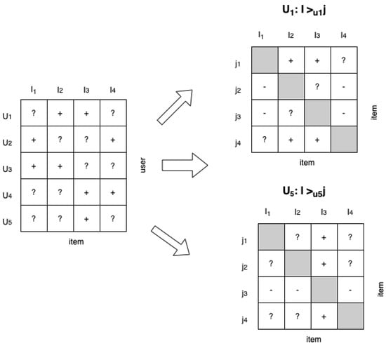 The creation of user specific pairwise preferences between pair of items showing the preference of the user for item i over j.