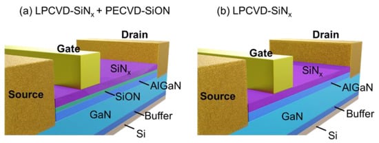 - Geng, K.; Chen, D.; Zhou, Q.; Wang, H. AlGaN/GaN MIS-HEMT with PECVD SiNx, SiON, SiO2 as Gate Dielectric and Passivation Layer. Electronics 2018, 7, 416. [Google Scholar] [CrossRef] [Green Version]