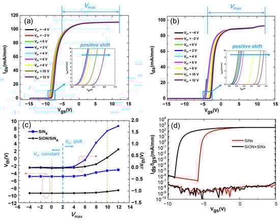 Transfer characteristics of AlGaN/GaN MIS-HEMTs with (a) SiNx/SiON dual layers and (b) SiNx layer under various gate-source voltage sweeps. (c) The threshold voltage (Vth) and the Vth hysteresis (∆Vth) as a function of gate voltage stress (Vmax). (d) Gate leakage comparison.