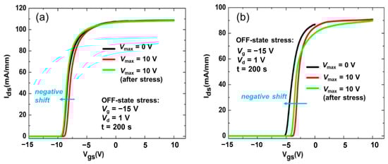 The influences of the OFF-state stress was also investigated to further compare the performance of the two kinds of devices as shown in Figure 3. The transfer curves of the MIS-HEMTs were first measured Vmax = 10 V (shift region as shown in Figure 2c). Then, the devices were stressed by an OFF-state condition with Vgs of −10 V and Vds = 1 V for 200 s. The transfer curves of the MIS-HEMTs after the OFF-state stress were measured with Vmax = 10 V for comparison. The transfer curves with Vmax = 0 V (constant region as shown in Figure 2c) are also shown in Figure 3 as references. The Vth of the MIS-HEMT with SiNx/SiON composite gate dielectric exhibited a negative shift of 0.5 V, whereas the Vth of the MIS-HEMT with SiNx only gate dielectric showed a negative shift of 0.62 V. The negative shift after the OFF-state stress indicates an electron releasing process from the traps to the 2DEG channel resulting in the recovery of the Vth [12].