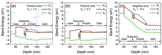 Schematic band diagrams of MIS-HEMTs at (a) positive bias (Vmax = 1 V), (b) positive bias (Vmax = 3 V), and (c) negative bias (Vgs = −9 V).