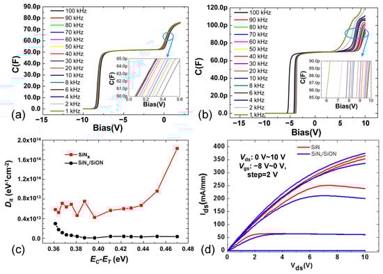 Capacitance method was used to evaluate the interface states [32]. Figure 5a,b show the C-V curves of the two kinds of MIS-HEMTs at different frequencies from 100 kHz to 1 kHz. There are two steps in the C-V curves. The first one corresponds to the 2DEG accumulation at the AlGaN/GaN interface. The second one corresponds to that at the dielectric/AlGaN interface. The interface state density can be estimated based on the frequency dispersions of the second slope onset. The detailed calculation formula can be found in [14]. The interface state density distributions as a function of energy level are presented in Figure 5c. At the energy level of 0.36 eV~0.47 eV, the interface state density of the MIS-HEMT with SiNx/SiON composite gate dielectric was on the order of ~1013, which is significantly smaller than that of the MIS-HEMT with SiNx only. Compared with the SiNx only dielectric, SiNx/SiON can effectively reduce the overall interface states density, especially at deep energy levels. These results further prove that the SiNx/SiON composite gate dielectric in this work can considerably reduce the interface state density thereby improving the electrical performance of the GaN-based MIS-HEMTs. The thicknesses of SiNx and SiON extracted from the C-V profiles are 20.3 nm and 9.6 nm, respectively, which are consistent with the designed values. The output curves are shown in Figure 5d. The on-resistance for the MIS-HEMTs with SiNx/SiON composite gate dielectric and SiNx only gate dielectric is 3.12 mΩ·cm2 and 3.4 mΩ·cm2, respectively.