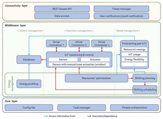 The Middleware Layer is where the integration of drivers for sensors and actuators, energy forecasting by IoT devices, the storage of the consumption in a NoSQL database, and energy management are presented. The middleware layer is divided into three types of data management: historical management, real-time management, and ahead management. The historical management of the building is used to access data that have been recorded in the past, in this case, data previously stored in the database. Real-time management is used to monitor and visualize the data that are collected in real-time, and to provide real-time energy management. The ahead management is to provide energy management, data forecasts, and to allow the execution of forecast routines, which will serve to forecast future energy needs to achieve the balance of demand and supply. Finally, the Core Layer is composed of the essential components for the system to work, such as the configuration file, the task manager, and the thread orchestration, to enable the multi-threading of the solution.