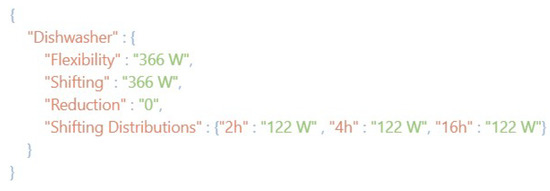 Regarding data access, this is done through the IoT-based framework for building energy management presented in Section 3.1. Each data access token is associated with an IoT device and the data from each IoT device are presented in a JSON document. Figure 2 shows a response to the requested data in JSON that shows how the data are sent from the end-user/IoT device that contains the forecasted flexibility for the DR event, the forecasted reduction, the forecasted shifting, and the different shifting distributions.