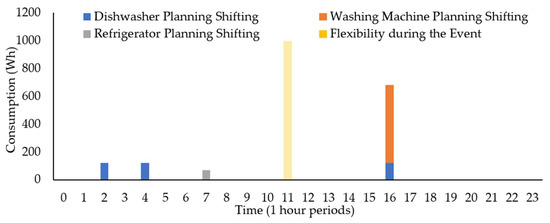 The graph of Figure 3 shows the shifting planning of IoT devices referring to end-user 2 that have flexibility during the event. However, the end-user owns more IoT devices, but not all of them are represented in the graph since they have no flexibility during the DR event.