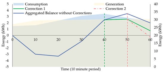 Figure 4 illustrates the performed real-time monitoring, in a 10-min loop, during the DR event that occurred at 11:00 a.m. On the one hand, according to the vertical axis on the right, this figure illustrates the total EC consumption and generation in areas. On the other hand, the Aggregated Balance without corrections (ABWC) and Corrections 1 and 2 are illustrated in lines with the vertical axis on the left. It is important to highlight that the illustrated consumption already accounts for the flexibility of the main IoT devices invited to the DR event.