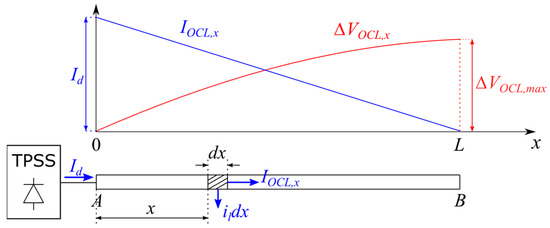 Equation (14) shows that ΔVOCL,x varies with quadratic law as a function of x, and it assumes the maximum value at line end B (see Figure 2) (i.e., for x = L), as expressed in the following formula: