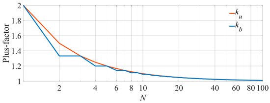 In this work, the computation of the maximum OCL voltage drop is performed based on a plus factor ranging between 1 and 2, which depends solely on the number of vehicles N inside the FS. The plus factor is represented in Figure 3 for both unilaterally (ku) and bilaterally (kb) fed FSs. By increasing the number of vehicles, the plus factor decreases, as the load is shared among more line points.