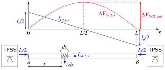 Similar to the one-sided supply, the current consumption per unit length (il) is given by Equation (10). According to assumption 1 in Section 2.1, each TPSS delivers a current equal to Id/2 = il·L/2. At a distance x from the TPSS, the OCL current is given by