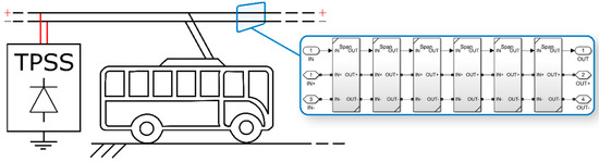 As mentioned in Section 4, TPSSs are modeled through the Thevenin equivalent circuit with a diode in series, which is a reasonable assumption for emulating 12-pulse rectifiers typically feeding transport systems relying on electric traction. Referring to this case study, we considered an open-circuit voltage Vth at the substation terminals of 830 V DC (hypothesizing 615 V on the AC side of the rectifier) and an equivalent series resistance of 68 mΩ in steady state conditions [27]. Based on the knowledge gained on Bologna’s trolleybus infrastructure, each TPSS is supposed to be grounded through a 0.5 Ω resistor.
