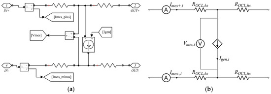 The first strategy consists of inserting a current-controlled voltage source within the OCL section run by the vehicle [12], which is connected in series with an ammeter measuring the line current. By keeping track of the vehicle position, the voltage value assumed by the controlled generator is evaluated as the product of the OCL resistance per unit length, the distance between the vehicle itself and the adjacent TPSS feeding that section, and the measured OCL current. The coefficient of proportionality between the voltage source value and the ammeter reading is the amount of resistance to be attributed to the variable resistor. Nevertheless, it should be stressed that such a formulation requires management of the initial conditions to avoid an unphysical representation (e.g., the short circuit of the entire OCL if the initial voltage is set to zero), and it experiences criticalities in the event of null resistance (e.g., when the vehicle is in the vicinity of the TPSS).
