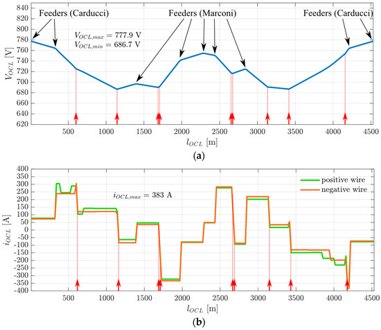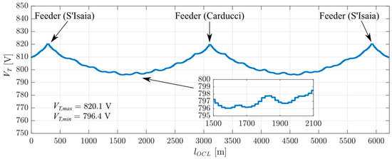 The correct functioning of the electrical infrastructure requires that the line voltage does not fall below a value that the standards set at two-thirds of the nominal voltage (the rated value is 750 V in EN 50163 [16]). Hence, it is necessary to verify the maximum voltage drops corresponding to the heaviest load conditions. For the sake of completeness, the same standard sets the upper line voltage limit to 1000 V; however, overcoming such a threshold is quite unlikely, as the acceleration time of the vehicle between two bus stops prevails over its braking phase duration.