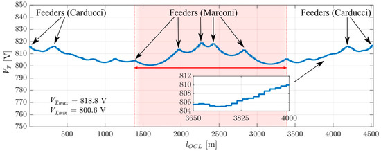 The graph in Figure 8 displays the catenary voltage trend that the only vehicle sensed while traveling within FS 1 as a function of its linearly time-varying position lOCL (i.e., position along the single bifilar line to which the trolleybus was connected). The following remarks are provided: