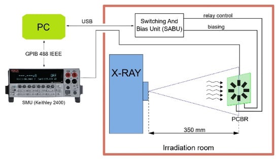 During irradiation, an automatic system for measuring the electrical transfer characteristics was used [,]. This system contains the custom-made switching and bias unit (SABU) [], and for these experiments a specially designed printed circuit board with relays (PCBR) [], in which the eight VDMOSFETs were placed, was implemented. The PCBR is connected with SABU via two DSUB cables—one DSUB-25 is for relay control, and the other DSUB-9 is for transistors biasing. The SABU contains a PIC16F887 microcontroller that communicates with the PC via an FTDI chip. The source-measure unit (Keithley 2400 SMU) is connected to the computer via USB-GPIB interface card. The entire system (SABU, PCBR, and SMU) is controlled by the PC using a custom-written program in C#. The block diagram of experimental setup is displayed in Figure 1.