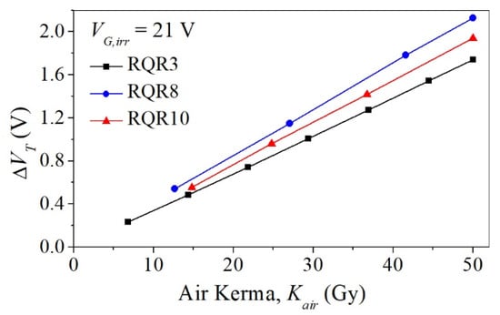 It was shown that the dependence of ∆VT on Kair for VG,irr = 0 V is linear up to the investigated air kerma of 50 Gy []: