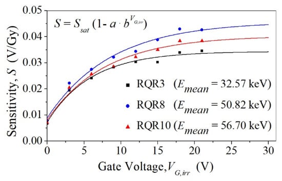 where S is the sensitivity of the transistors to radiation. Linearity is expected to increase with increasing gate polarization. Here, it is proven that the ∆VT = f(Kair) dependence for all used gate polarizations is linear according to Equation (5) (shown only for VG,irr = 21 V in Figure 2), and r-square (r2) correlation coefficients of linear regression are higher than 0.99 for all cases. Table 2 shows the sensitivity of irradiated VDMOSFETs.